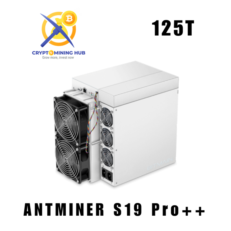 Model Antminer S19 Pro++ from Bitmain mining SHA-256 algorithm with a maximum hashrate of 125Th/s for a power consumption of 3250W.