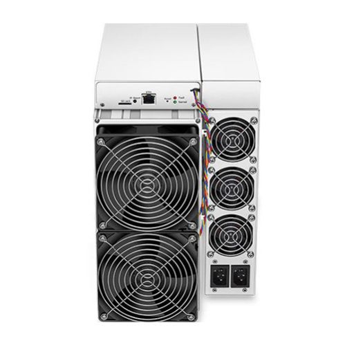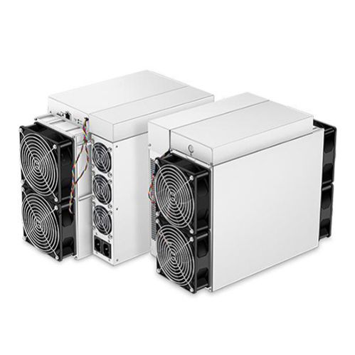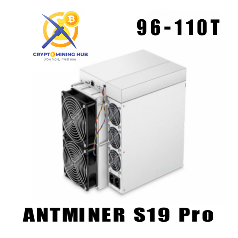 Model S19 Pro from BITMAIN mining SHA-256 algorithm with a maximum hashrate of 104T/s for a power consumption of 3068W.