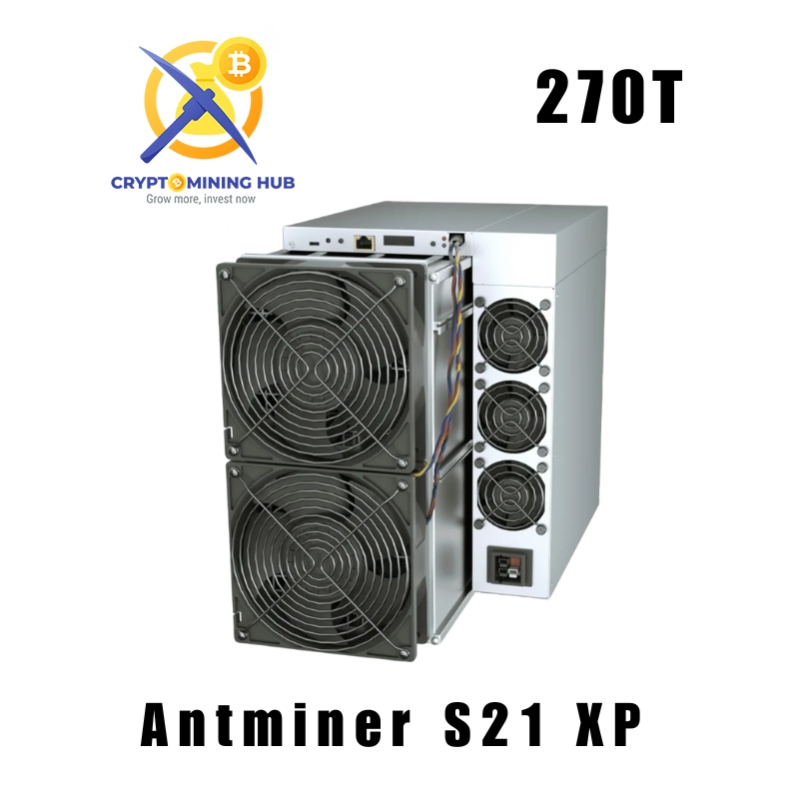 Model Antminer S21 XP (270Th) from Bitmain mining SHA-256 algorithm with a maximum hashrate of 270Th/s for a power consumption of 3645W.